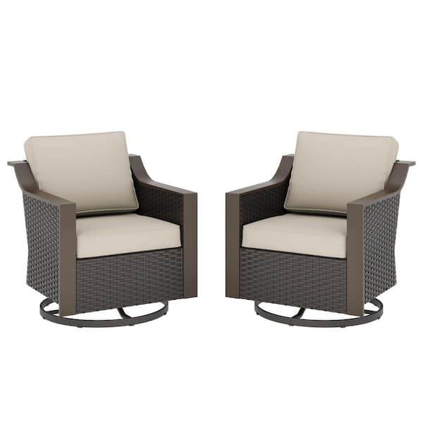 2-Piece Wicker Outdoor Rocking Chair Patio Swivel Chair Set with Gracefully Sloped Armrest and Beige Cushions