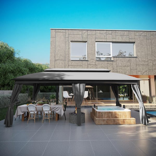 20 ft. x 10 ft. Gray Outdoor Patio Double Vented Roof Gazebo with Curtains and Mosquito Netting