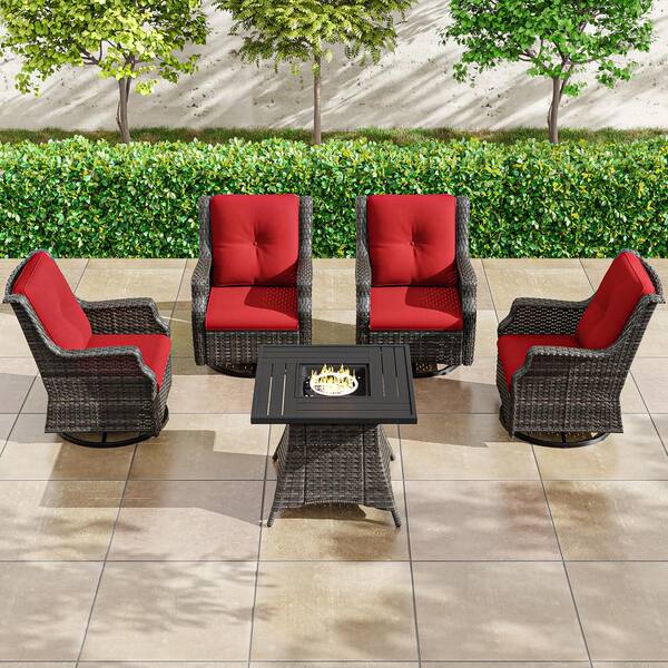 5-Piece Qutdoor Wicker Patio Fire Pit Swivel Rocking Chair Set with Square Fire Pit Table and Red Cushions