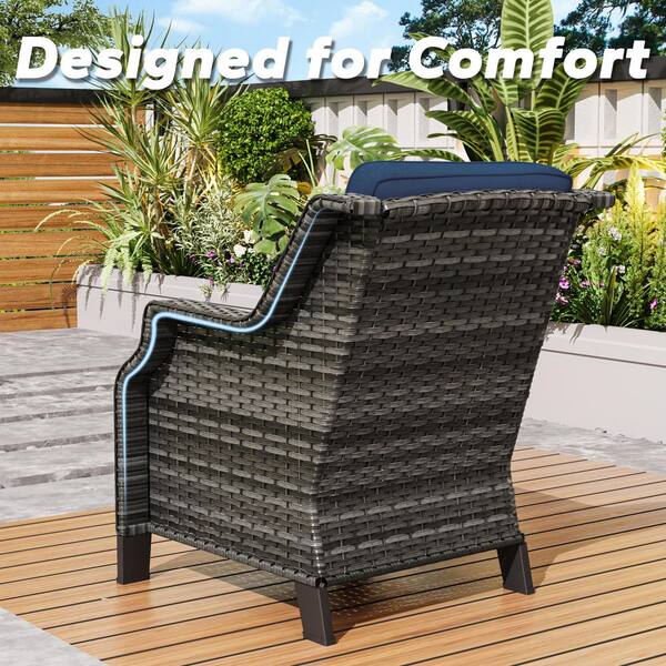 5-Piece Wicker Outdoor Fire Pit Patio Chair Set with Blue Cushions and Rectangular Fire Pit Table