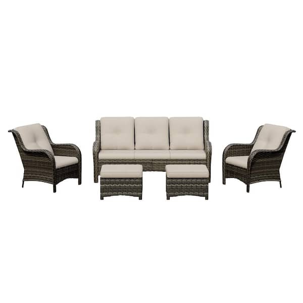 5-Piece Wicker Outdoor Patio Seating Conversation Set Sectional Sofa with Beige Cushions