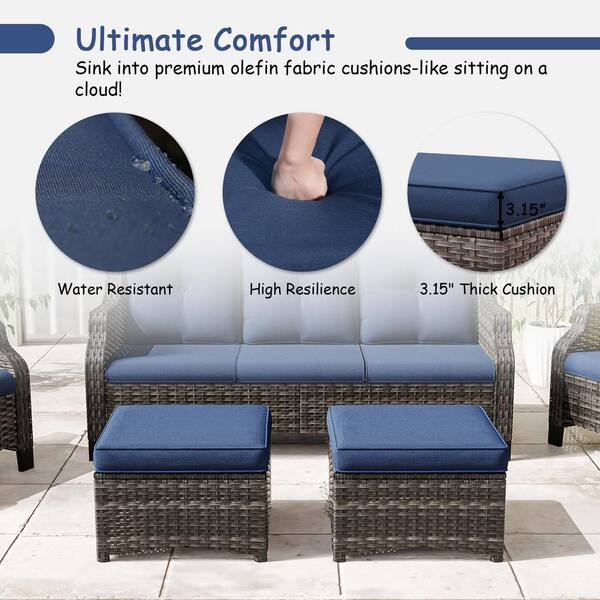 6-Piece Wicker Outdoor Patio Conversation Set Sectional Couch with Ottomans, Brown Steel Table and Blue Cushions