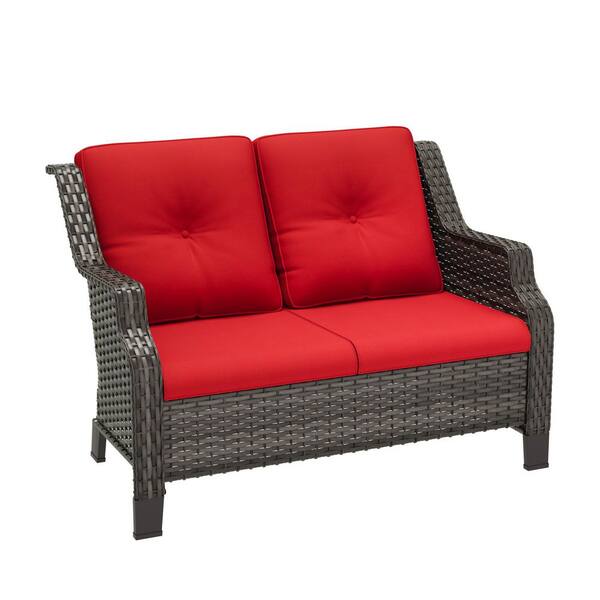 Brown Wicker Outdoor Loveseat Patio Sofa Deep Seating with Red Cushions