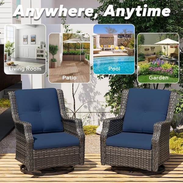Wicker Patio Outdoor Lounge Chair Swivel Rocking Chair with Blue Cushions (2-Pack)
