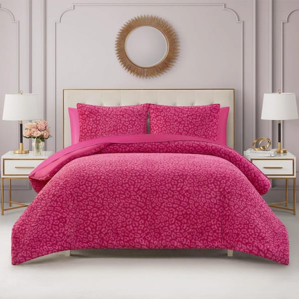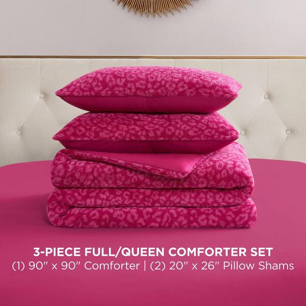 Cheetah Feathered 3-Piece Hot Pink Animal Microfiber Polyester Full/Queen Comforter Set