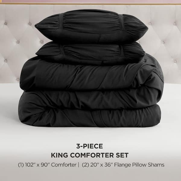 Ribbon Ruched 3-Piece Black Solid Color Microfiber King Comforter Set