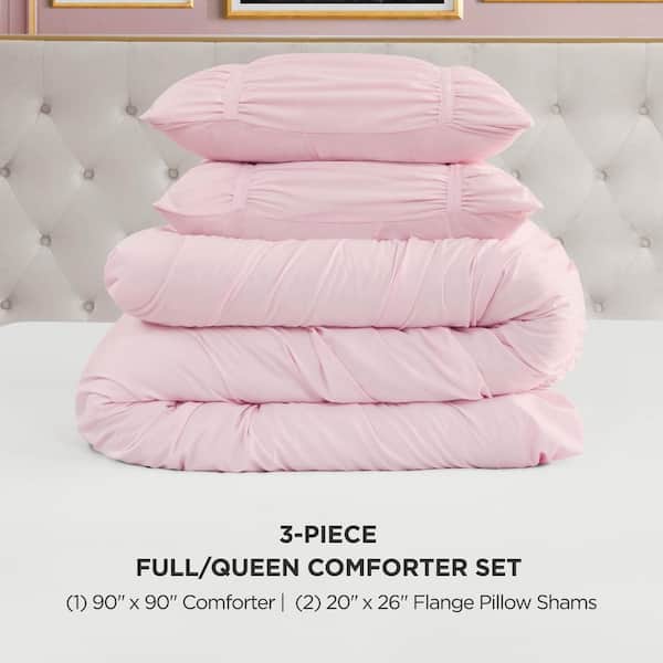 Ribbon Ruched 3-Piece Pink Marshmallow Solid Color Microfiber Full/Queen Comforter Set