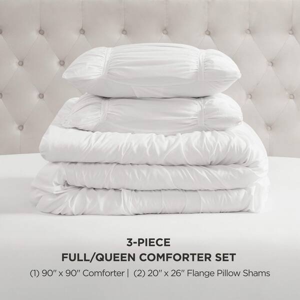 Ribbon Ruched 3-Piece White Solid Color Microfiber Full/Queen Comforter Set