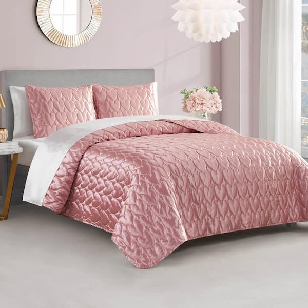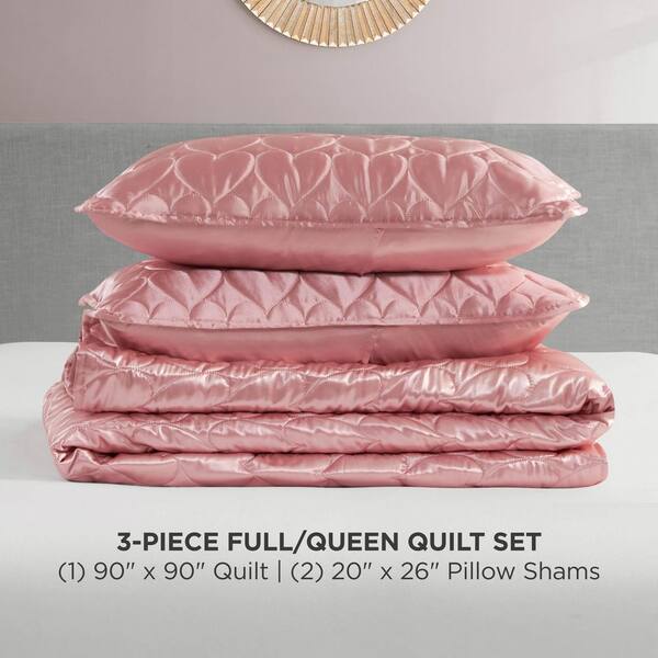 Satin Heart Stitched 3-Piece Rose Pink Geometric Polyester Full/Queen Quilt Set