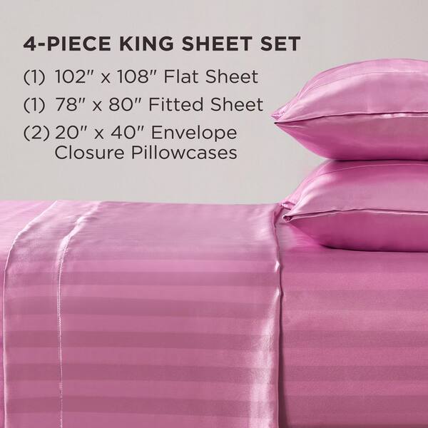Silky Satin Damask 4-Piece Pink Striped Polyester King Soft Sheet Set