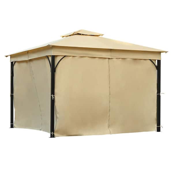10 ft. x 12 ft. Beige Polyester and Steel Outdoor Gazebo Tent with Double Roofs Mosquito Netting and Privacy Screens