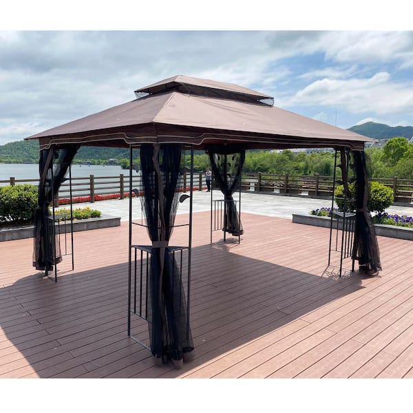 13 ft. x 10 ft. Brown Patio Gazebo Canopy Tent with Ventilated Double Roof and Mosquito Net