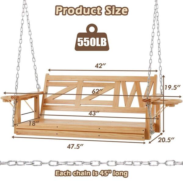 2-Person 550 lbs. Nature Wood Outdoor Front Porch Tree Swing Chair with Hanging Chain and Upgraded Cupholder
