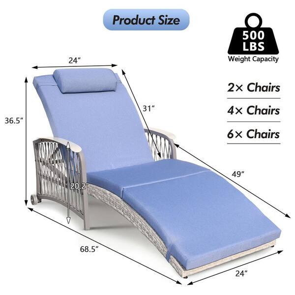 2-Piece Blue Wicker Rattan Outdoor Patio Chaise Lounge Set with 5-Position Backrest and Thickened Cushions and Wheels