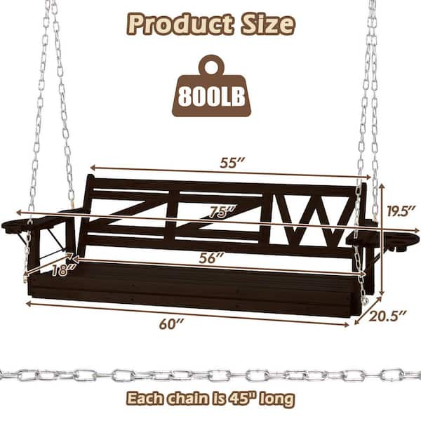 3-Person Dark Brown Wood Outdoor Porch Swing with Hanging Chains and Upgraded Cupholders for Garden