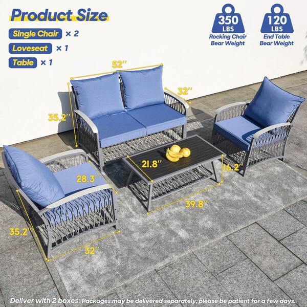 4-Piece Outdoor Patio Blue and Gray Metal Conversation Sectional Sofa Seating Set with Table and Thick Cushions