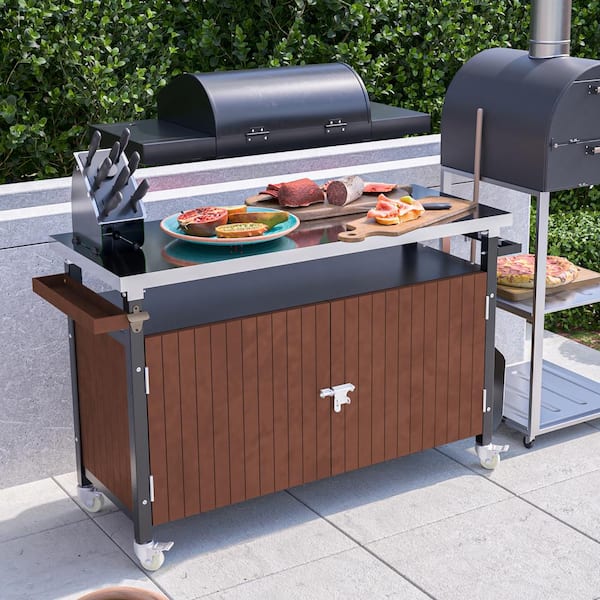 Brown Metal 52.7 in. Kitchen Island with Wheels and Spice Rack for Kitchen