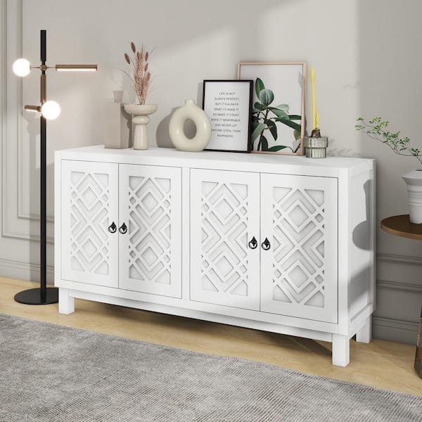 White MDF 60 in. Large Storage Space Sideboard 4-Door Buffet Cabinet with Pull Ring Handles for Living Room