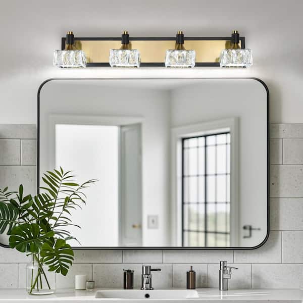 27.56 in. 4-Light Black and Brass Bathroom Vanity Light with Crystal Lampshade Modern Wall Sconce