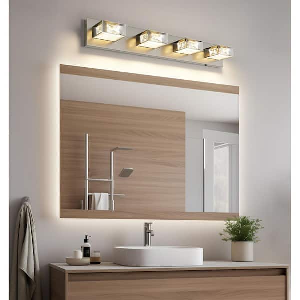 27.95 in. Nickle 4-Light Dimmable Crystal Bathroom Vanity Light with 5-CCT Adjustable Switch and 350° Swivel Range