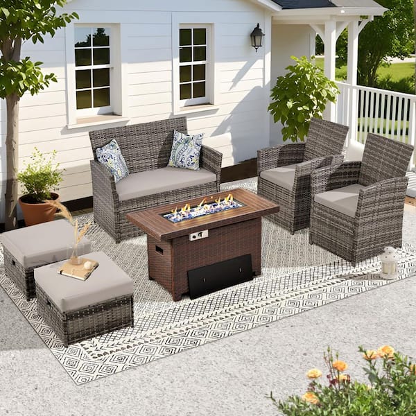 6-Piece Patio Dark-Gray Resin Wicker Conversation Set w/Coffee Table,Ottoman and Dark-Gray Cushions for Patio,Yard,Pool