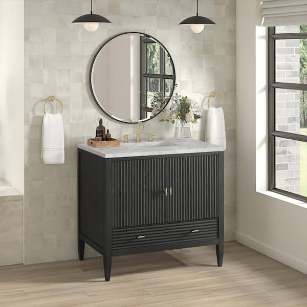 • Contemporary vanity with deeply fluted paneling and quartz top