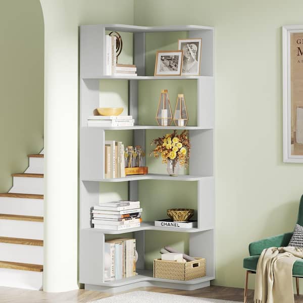Jannelly 65 in. Tall Silver Gray Engineered Wood 6-Shelf Corner Standard Bookcase Bookshelf with Anti-Drop Panel