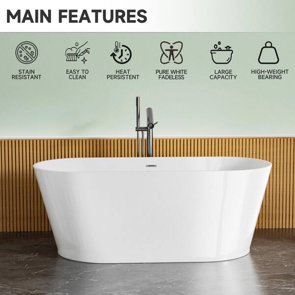 59 in. x 30 in. Acrylic Freestanding Soaking Bathtub with Chrome Overflow and Pop-Up Drain in White, Stand Alone