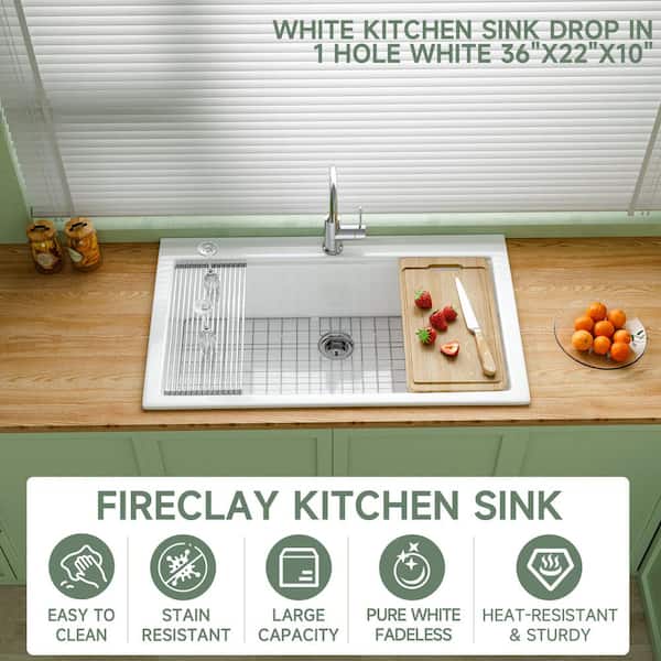 Workstation 36 in. Drop-In Kitchen Sink 1 Faucet Hole Single Bowl White Fireclay Sink with Cutting Board