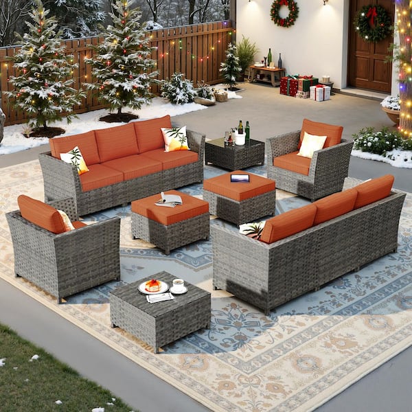 Jasmine 12-Piece Wicker Outdoor Sectional Set with Orange Red Cushions