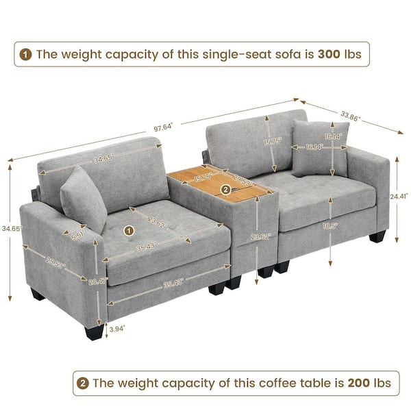 Sunderland 97.64 in. Chenille Gray Tufted Sectional Sofa Couch with Side Table, Split Left and Right Seats, 2-Pillows