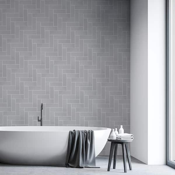 • Neutral gray mosaic in an easy to install herringbone pattern
