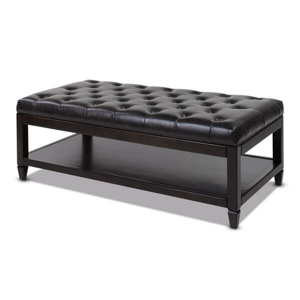 Sylvan Farmhouse Birch Wood Tufted Cocktail Storage Ottoman, Vintage Black Brown Faux Leather