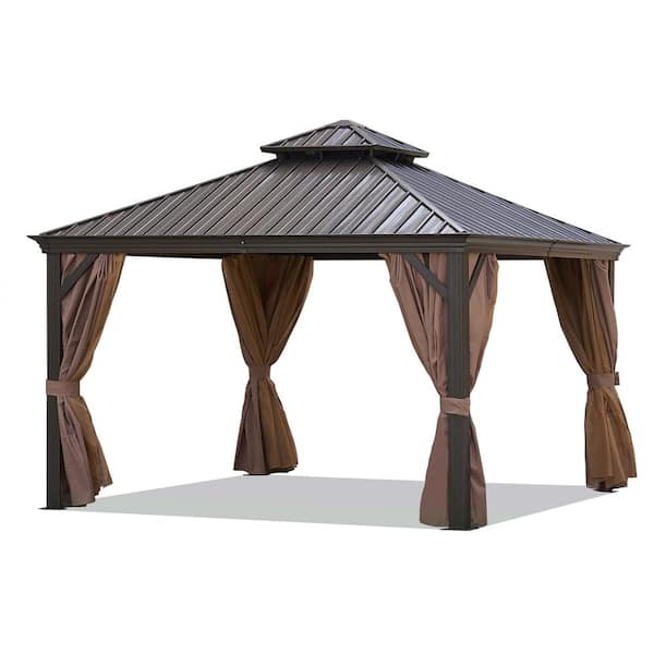 12 ft. x 12 ft. Outdoor Bronze Aluminum Hardtop Patio Gazebo with Galvanized Steel Double Roof with Netting and Curtains