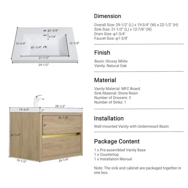 29.53 in. W x 19.69 in. D x 22.44 in. H Wall-Mounted Bath Vanity in Oak Natural Wood with White Resin Top