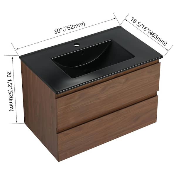 30 in. W x 18.3 in. D x 20.5 in. H Wall-Mounted Bathroom Vanity in Brown Oak with Black Ceramic Top