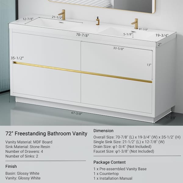 70.87 in. W x 19.69 in. D x 35.43 in. H Freestanding Bath Vanity in Glossy White with White Resin Top