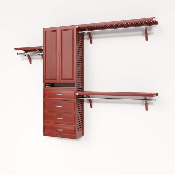 72 in. W - 120 in. W Red Mahogany Reach in with 4 Drawers and Wood Door 12 in. Shelf Wood Closet System