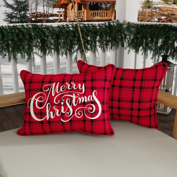 12 in. L x 16 in. W x 5 in. T Rectangular Reversible Outdoor Lumbar Pillow in Merry Christmas and Red Plaid