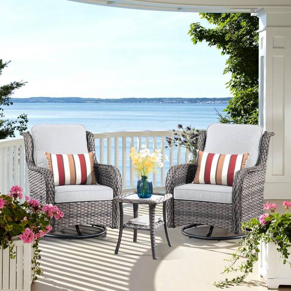 Joyoung Gray 3-Piece Wicker Outdoor Patio Conversation Seating Set with Gray Cushions and Swivel Rocking Chairs