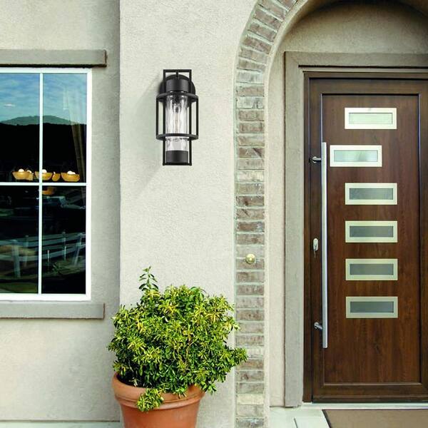 1-Light Textured Black Water Glass Not Motion Sensing Dusk to Dawn Outdoor Hardwired Wall Lantern Sconce, No Bulbs