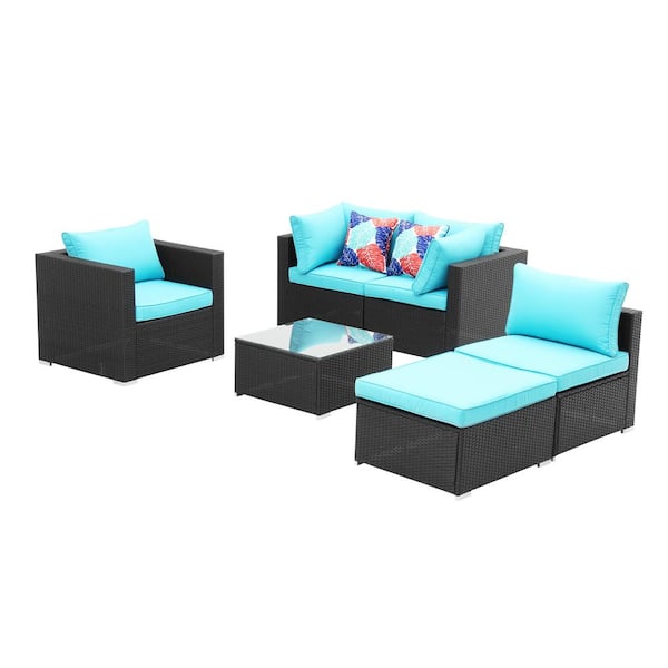 Blue 6-Piece Rattan Patio Conversation Set with Cushions