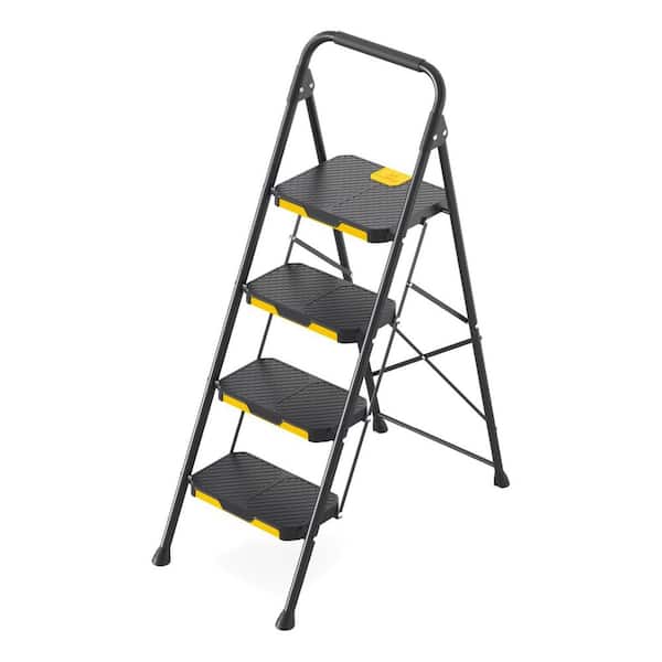4-Step Ladder Sturdy Steel Step Stool with Safe-Lock Handrail Anti-Slip Wide Pedals 800lbs Load Folding Portable Black
