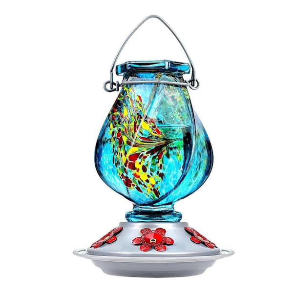 Blue Finish Hanging Hand Blown Glass Hummingbird Feeder 22 fl. oz. Nectar Feeder with 5 Metal Feeding Ports with Perches