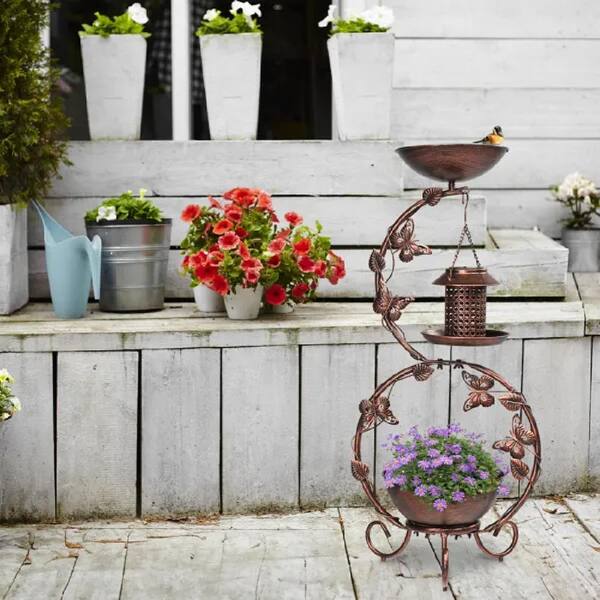 • 3-in-1 bird bath, solar-powered feeder and flower planter