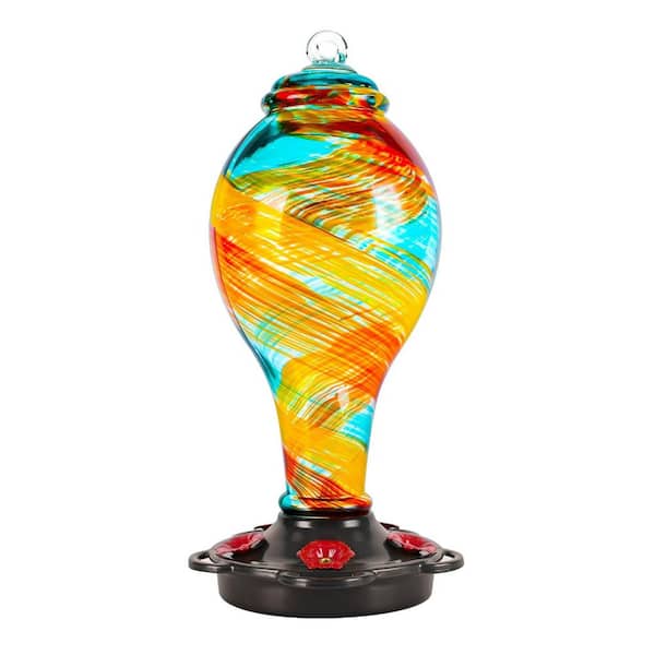 Multi-Colored Ribbon Hand Blown Glass Hummingbird Feeder 36 fl. oz. Large Glass Nectar Feeder 5 Feeding Ports & Perches