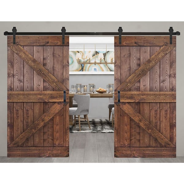 K Series 84 in. x 84 in. Dark Walnut Finished DIY Solid Wood Double Sliding Barn Door with Hardware Kit