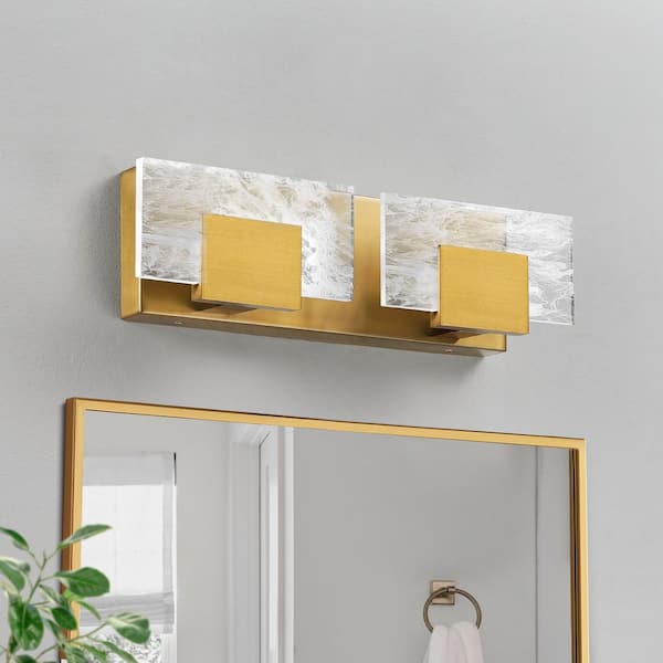 • Modern brushed gold LED vanity light with clear acrylic shade