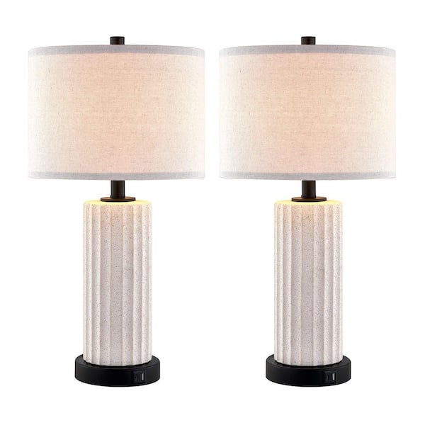 23 in. White Rustic Ceramic Table Lamp Set with Bulbs, Touch Control, Dual USB Ports and AC Outlet (Set of 2)