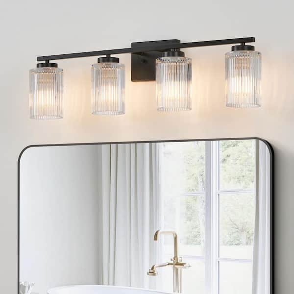 30 in. 4-Light Black Vanity Light with Clear Ribbed Glass Shades